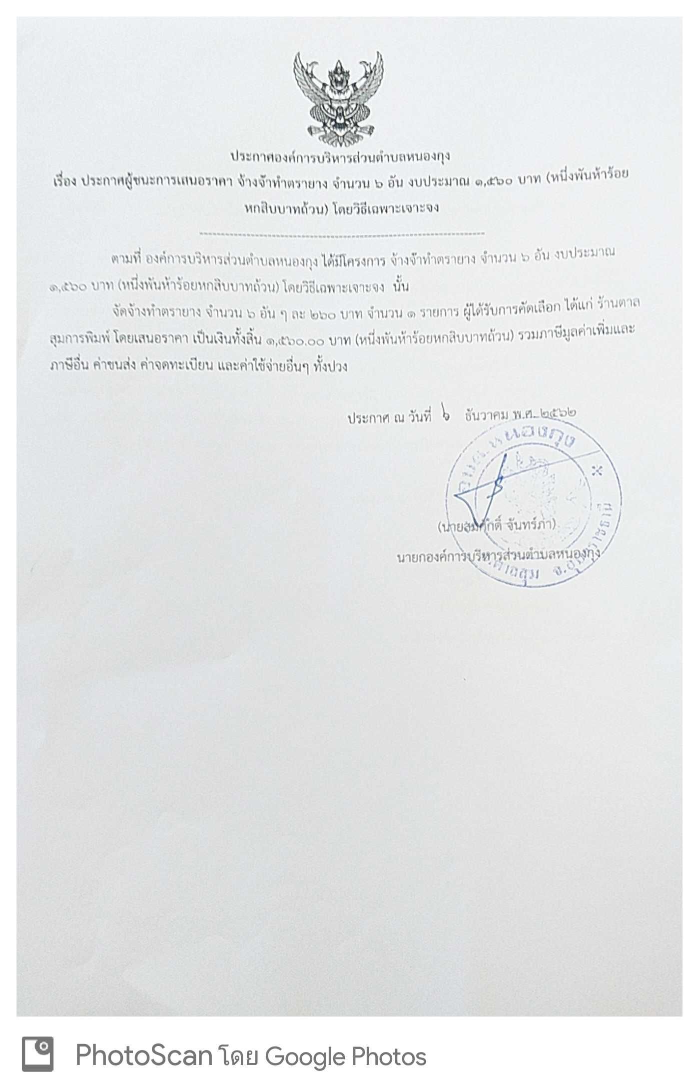 เรื่อง ประกาศผู้ชนะการเสนอราคา จ้างทำตรายาง จำนวน 6 อัน งบประมาณ 1,560 บาท (หนึ่งพันห้าร้อยหกสิบบาทถ้วน) โดยวิธีเฉพาะเจาะจง