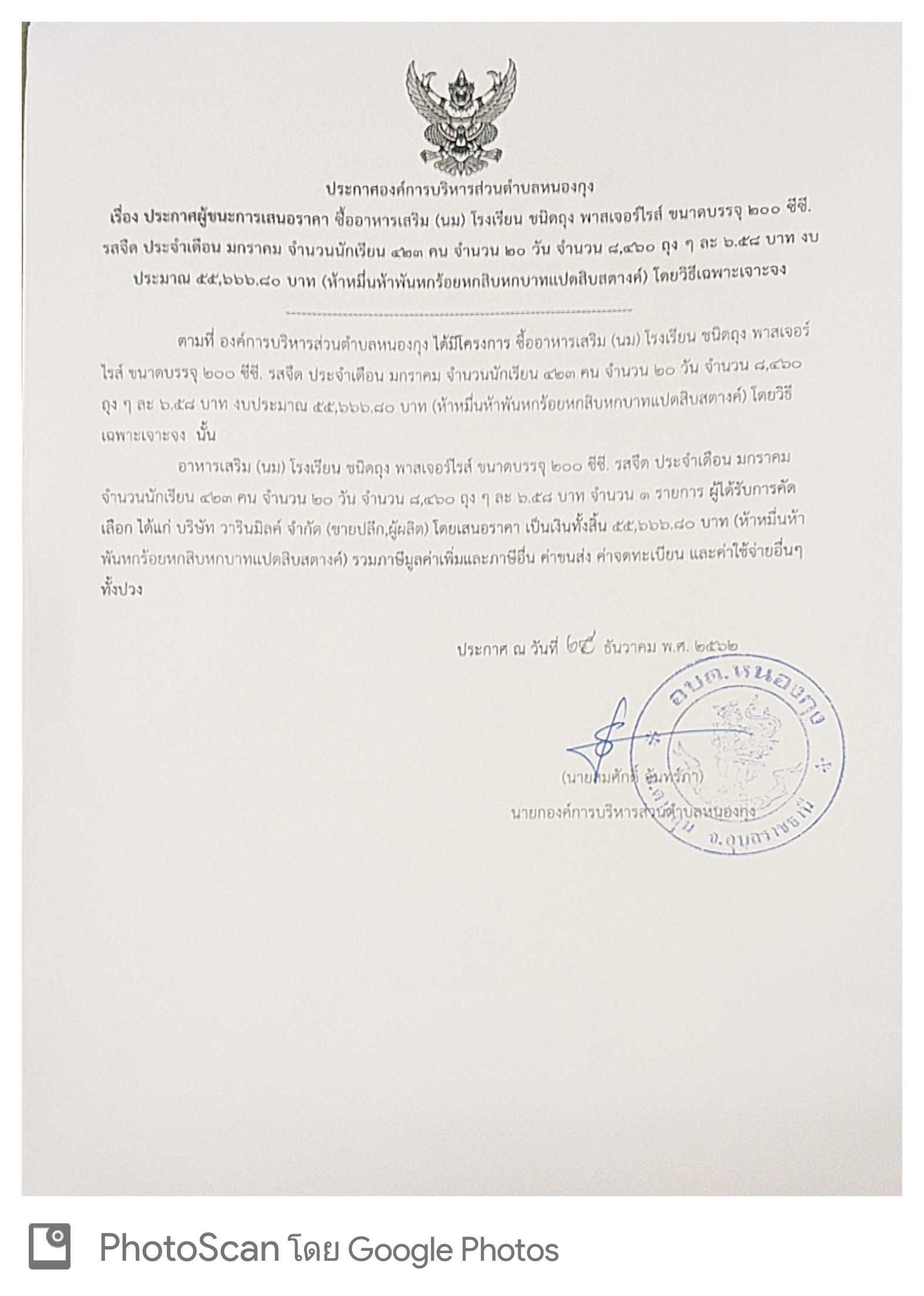 ประกาศผู้ชนะการเสนอราคา ซื้ออาหารเสริม (นม) โรงเรียน ชนิดถุง พาสเจอร์ไรส์ ขนาดบรรจุ 200 ซีซี.รสจืด ประจำเดือน มกราคม จำนวนนักเรียน 423 คน จำนวน 20 วัน จำนวน 8,460 ถุง ๆ ละ 6.58 บาท งบ ประมาณ 55,666.80 บาท (ห้าหมื่นห้าพันหกร้อยสิบหกบาทแปดสิบสตางค์) โดยวิธีเฉพาะเจาะจง