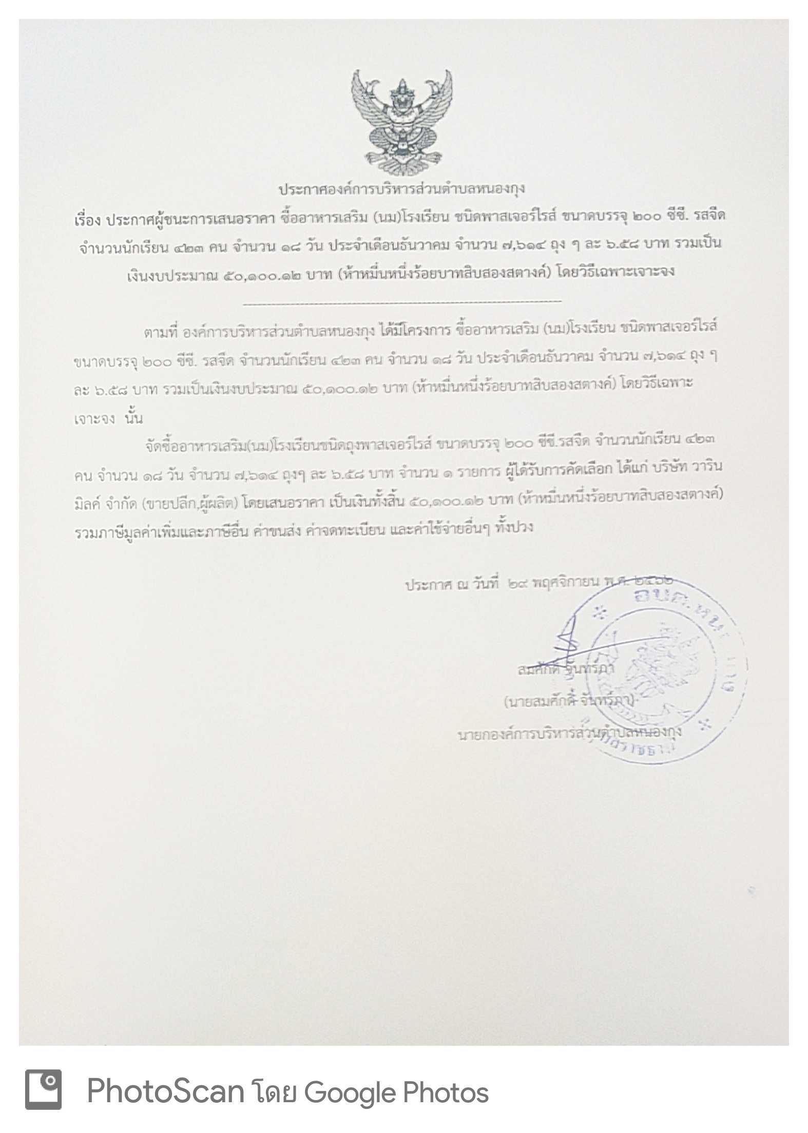 ประกาศผู้ชนะการเสนอราคา ซื้ออาหารเสริม (นม) โรงเรียน ชนิดพาสเจอร์ไรส์ ขนาดบรรจุ 200 ซี ซี. รสจืด จำนวนนักเรียน 423 คน จำนวน 18 วัน ประจำเดือนธันวาคม 2562 จำนวน 7,614 ถุง ๆ ละ 6.58 บาท รวมเป็นเงินงบประมาณ 50,100.12 บาท (ห้าหมื่นหนึ่งร้อยบาทสิบสองสตรางค์) โดยวิธีเฉพาะเจาะจง