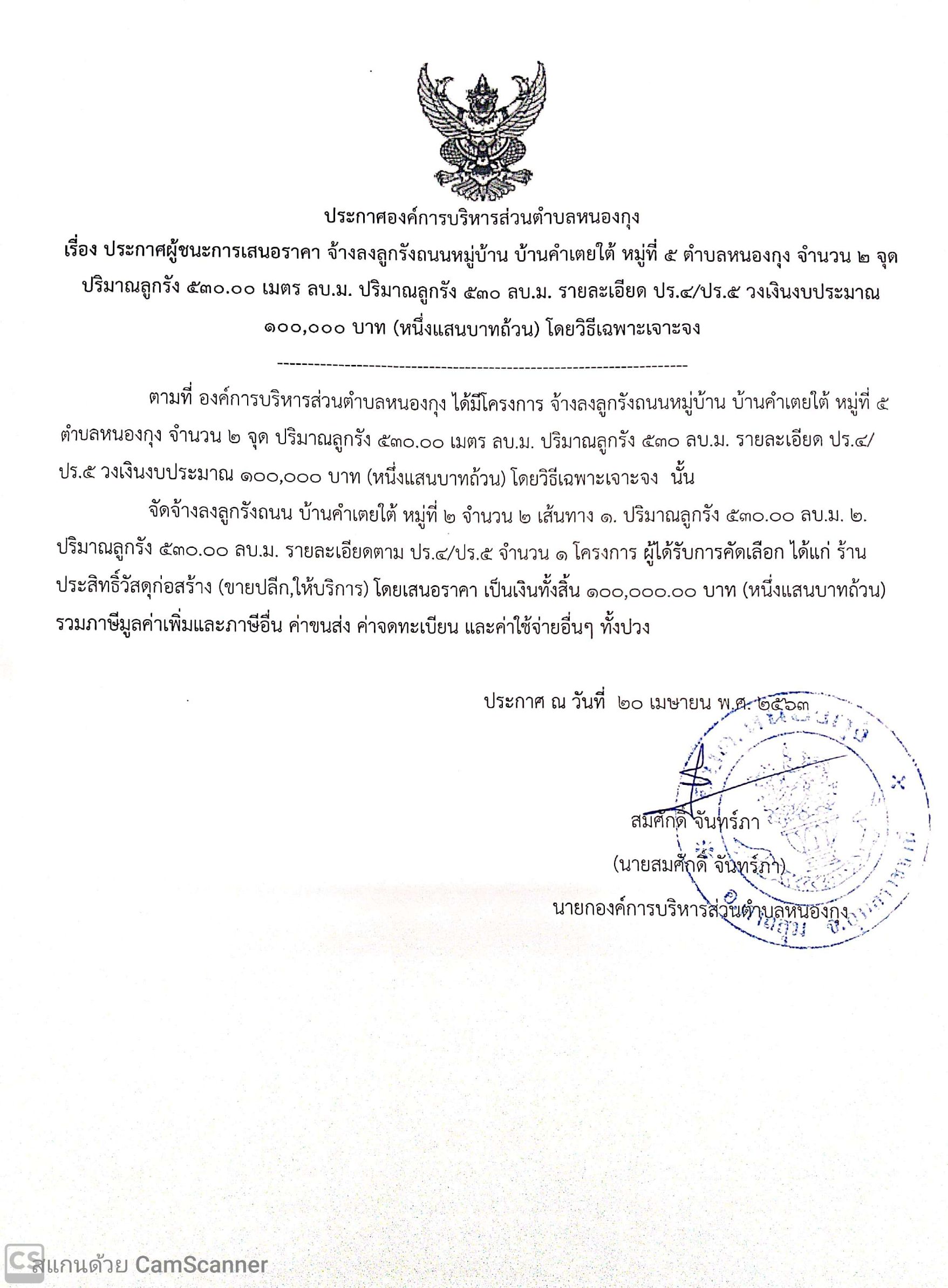 ประกาศผู้ชนะการเสนอราคา จ้างลงลูกรังถนนหมู่บ้าน บ้านคำเตยใต้ หมู่ที่ 5 ตำบลหนองกุง จำนวน 2 จุดปริมาณลูกรัง 530.00 เมตร ลบ.ม. รายละเอียด ปร.4/ปร.5 วงเงินงบประมาณ 100,000 บาท (หนึ่งแสนบาทถ้วน) โดยวิธีเฉพาะเจาะจง