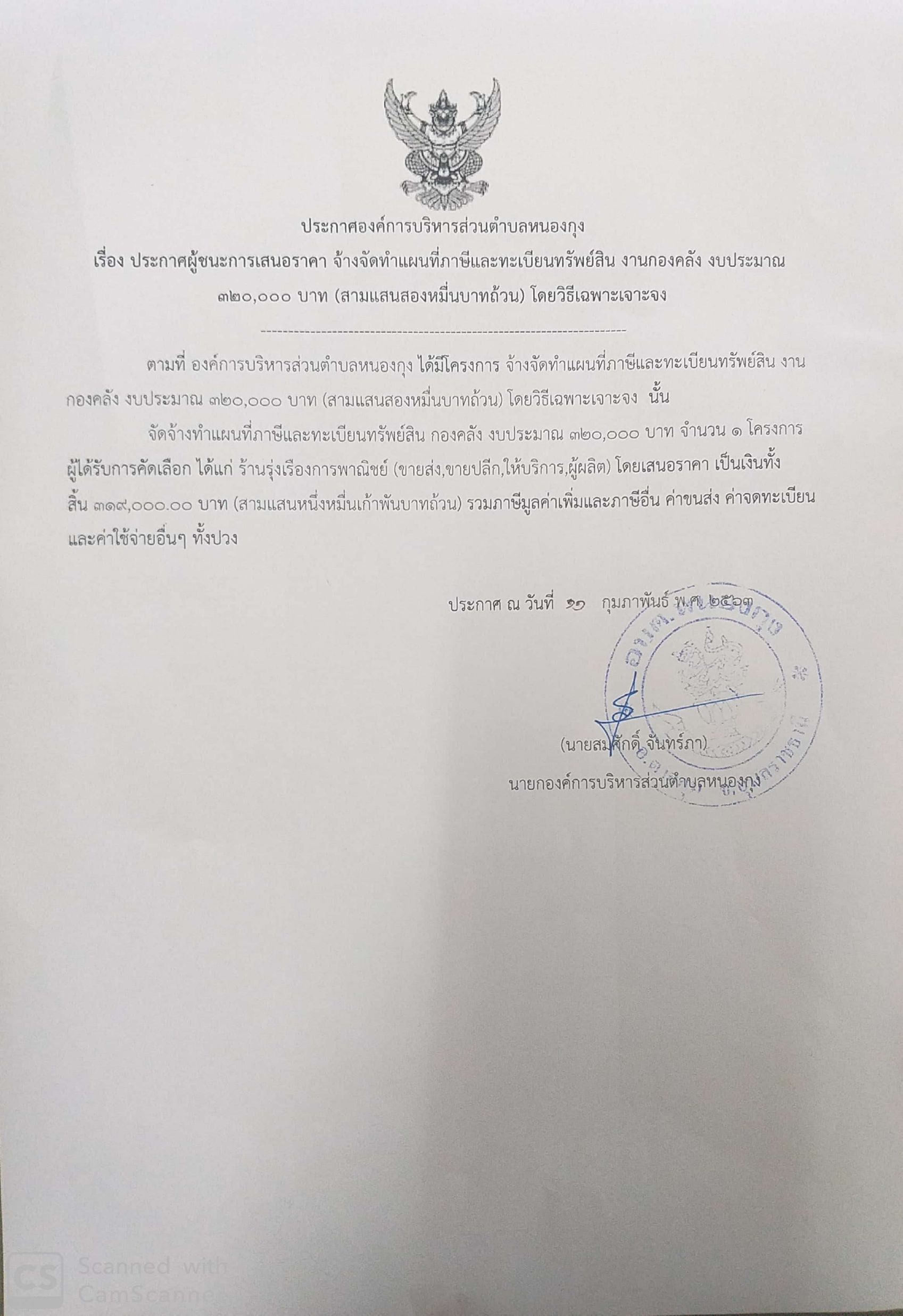 ประกาศผู้ชนะการเสนอราคา จ้างจัดทำแผนที่ภาษีและทะเบียนทรัพย์สิน งานกองคลัง งบประมาณ 320,000 บาท (สามแสนสองหมื่นบาทถ้วน) โดยวิธีเฉพาะเจาะจง