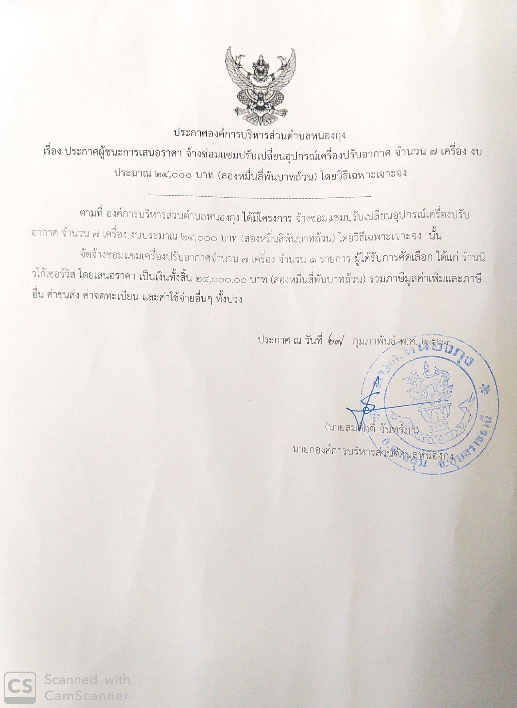 ประกาศผู้ชนะการเสนอราคา จ้างซ่อมแซมปรับเปลี่ยนอุปกรณ์เครื่องปรับอากาศ จำนวน 7 เครื่อง งบประมาณ 24,000 บาท (สองหมื่นสี่พันบาทถ้วน) โดยวิธีเฉพาะเจาะจง